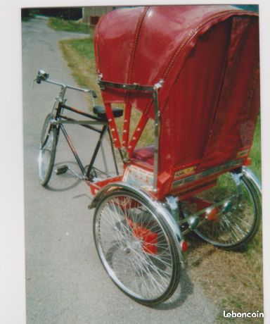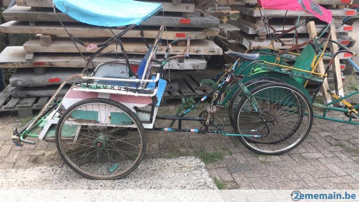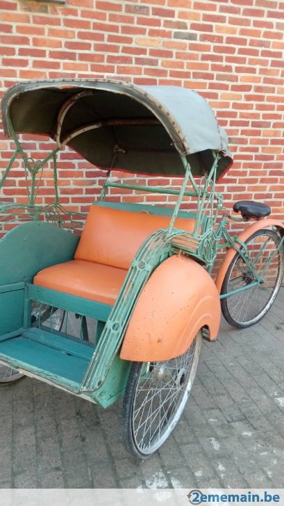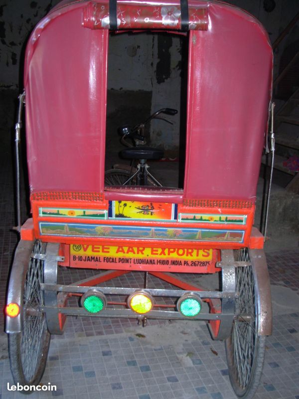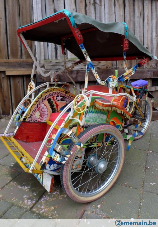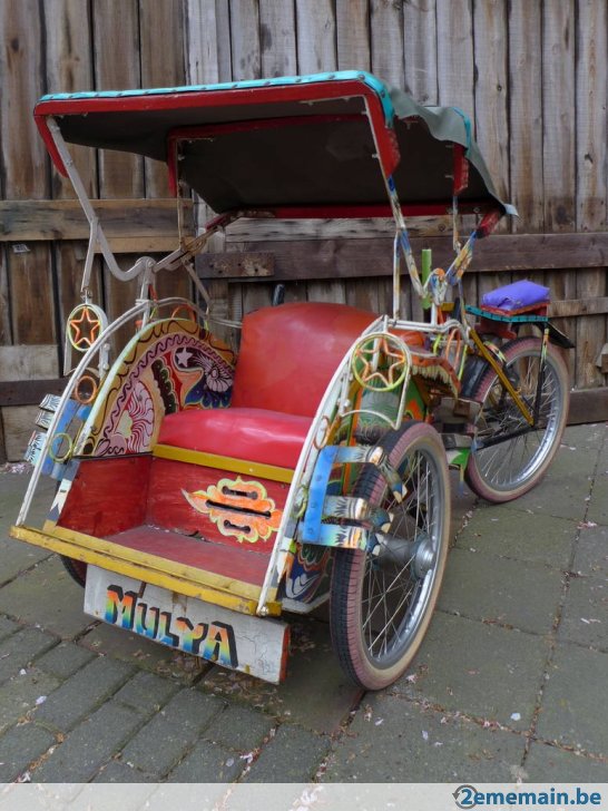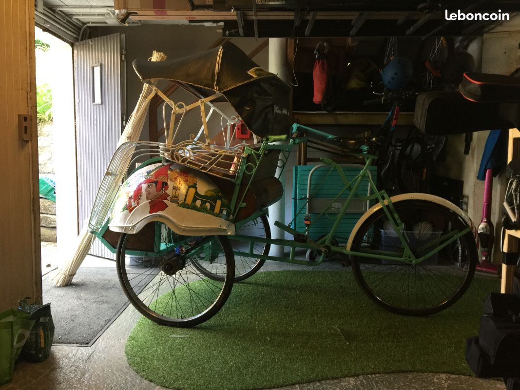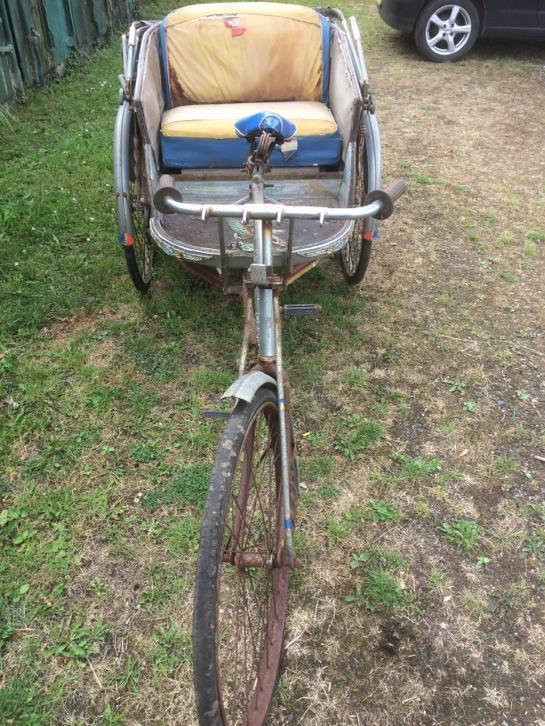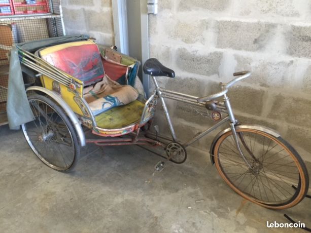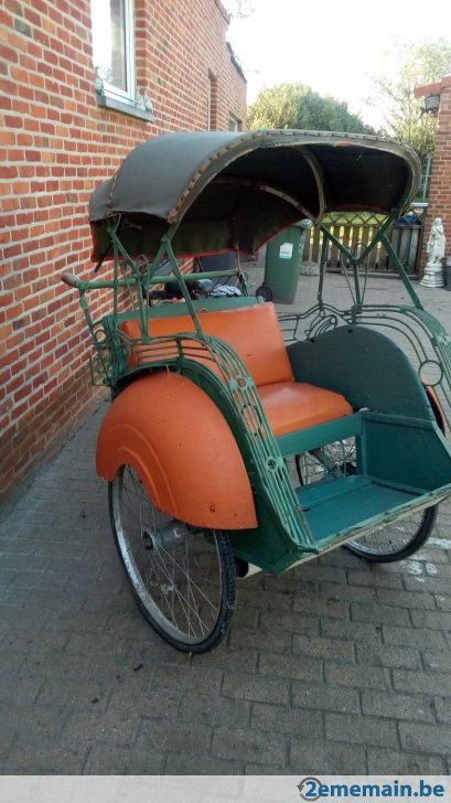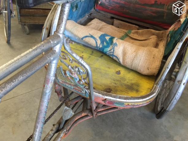 Notre avis : Rickshaw prétendument d'Indonésie (mais en réalité de Thailande) qui a l'air d'avoir survécu à quelques catastrophes naturelles. Beaucoup de travail à prévoir pour ceux qui aiment rouler avec les passager derrière.