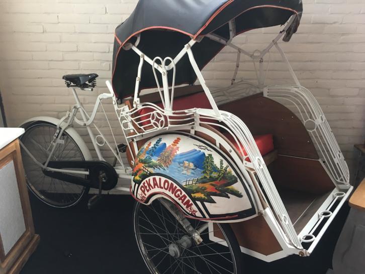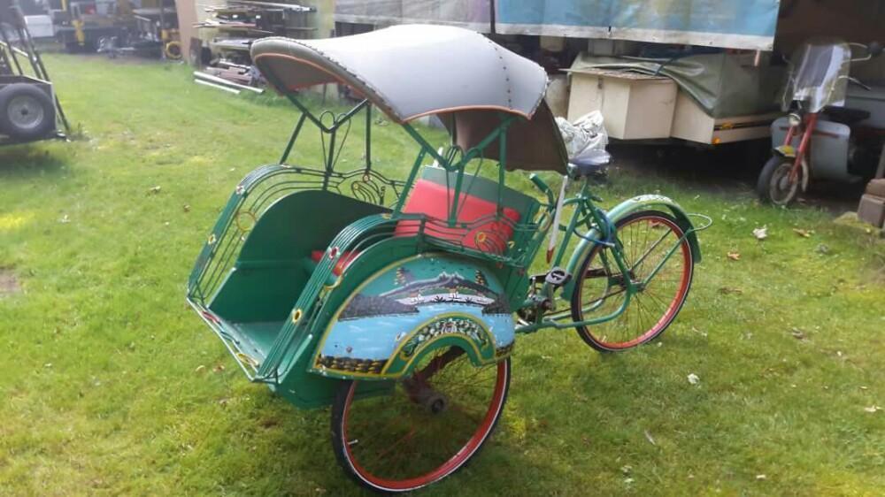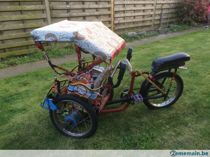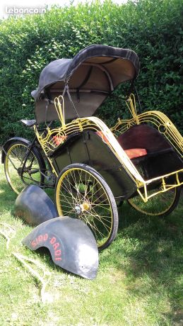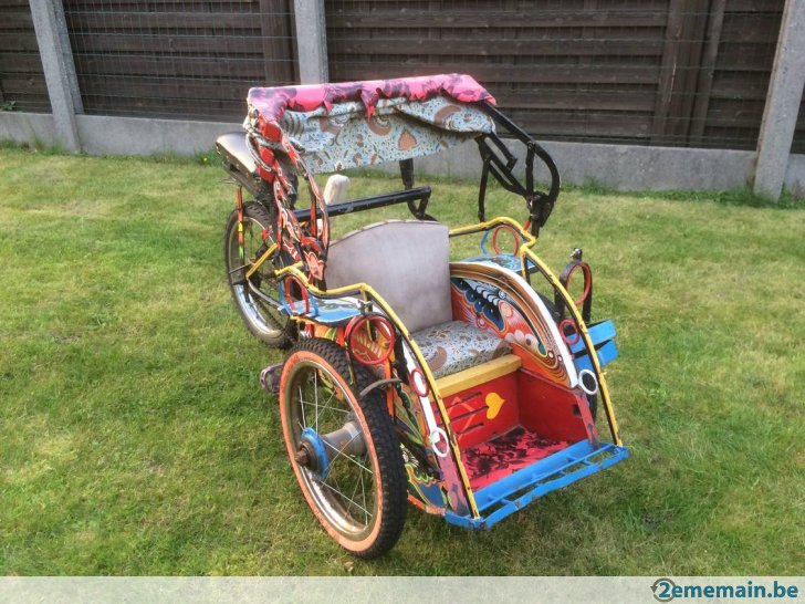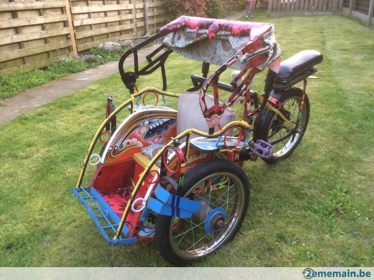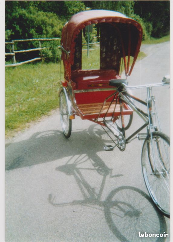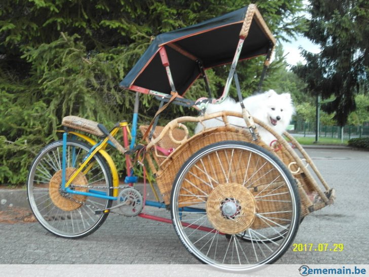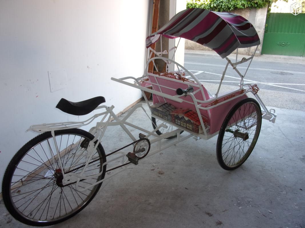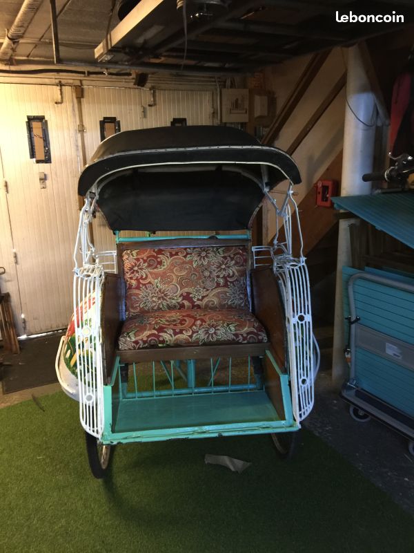 Notre avis : Rickshaw prétendument d'Indonésie (mais en réalité de Thailande) qui a l'air d'avoir survécu à quelques catastrophes naturelles. Beaucoup de travail à prévoir pour ceux qui aiment rouler avec les passager derrière.