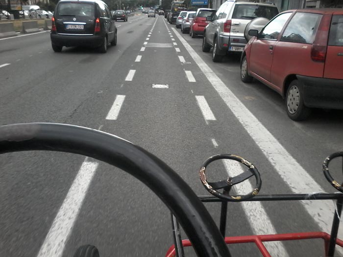 Lorsque nous lui demandons gentiment de libérer le passage, nous nous prenons des menaces et des insultes. Ensuite, après l'avoir aidé sans succès pendant 20 minutes à chipoter sa voiture et que nous demandons ce qu'il compte faire pour nous laisser sortir, nous nous reprenons des insultes et des menaces et apprenons que sa voiture n'est même pas assurée. Sa magnifique solution est de vouloir soulever le cuistax au-dessus de sa précieuse Mercedes (comme dans Rabbi Jacob). Pour ce faire, il recrute les gros bras de la rue, et effectivement, à 4 nous réussissons à libérer notre cuistax, malheureusement sans passer au-dessus de la voiture, mais en le passant renversé et sur le côté.