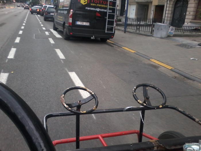 Nous livrons (seul!) le cuistax de Anneessens à l'ULB. 109m de dénivelé. Mais la principale difficulté ne vient pas de la monté - parfois des passants nous prennent en pitié - mais de la voiture mal garée et en panne devant la Cycloperativa. Et surtout de MachoMan, son propriétaire;.