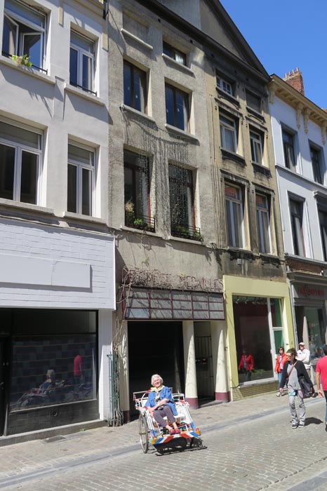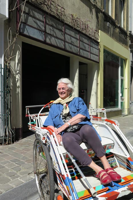 | ElisabethElisabeth est née dans le Limburg mais elle est Slovène. Elle habite aux Ursulines depuis quelques mois seulement : elle a décidé de venir habiter près de sa fille mais elle habitait précédemment près de Liège. Celle-ci habite à 5 minutes et elles se voient tous les jours. Sa fille a 2 chiens. Demain elles retournent pràs de Liège vendre la maison.Elle connaît très bien Bruxelles, elle rencontre même des gens qu'elle connaît lors de notre sortie. Elle trouve le piéonnier très calme, mais sa fille apprécie moins : elle a une voiture et un parking mais maintenant elle met beaucoup de temps à rejoindre ce parking. Elisabeth est émerveillée par tout ce qu'elle voit, elle trouve les arbres trè beaux. Dans une montée une femme nous aide à pousser le pousse-pousse. Sa grand-mère a aussi été dans un CPAS, mais maintenant elle est partie :-( |