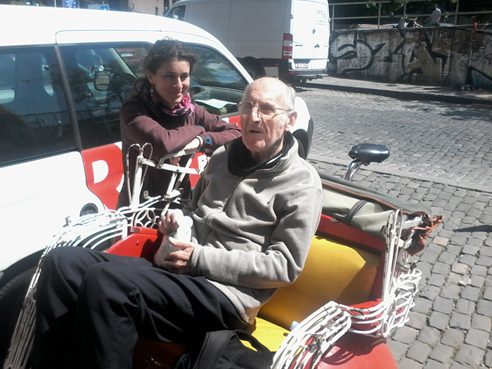 | EtienneEtienne a un message à livrer, nous partons dans les environs de la rue Dansaert pour déposer le message. Il vient d'Anvers et a déménagé à Molenbeek en 1937 et connaˆt très bien Bruxelles. On apprend que Victor Hugo a habité à la Grande-Place. Aidé d'un plan, il nous guide pour trouver la rue où il s'était garé lorsqu'il a vu la personne la dernière fois.C'était il y a 15 ans. Nous ne retrouvons pas la personne... Etienne était ingénieur. Il se souvient du début de la 2nde Guerre Mondiale, quand un jour son père leur a dit de descendre dans la cave car il y avait des combats aériens. Pour lui, lorsqu'on est une personne âgée, il est très important de ne pas tomber, car on se casse quelque chose, on va chez le médecin et 3 semaines après 1/3 sont morts. Il se demande beaucoup quels sont nos motivations pour ces sorties, si elles sont commerciales, religieuses ou autres. Dans le Piétonnier, il pense que les commerces vont mourir car les gens n'y accèdent plus en voiture. Etienne note qu'il y a 6 milliards d'humains sur la planète et qu'on a beaucoup de chance, car aujourd'hui nous pouvons rouler avec LUI. La prochaine fois, Etienne veut être celui qui pédale et nous serons les passagers. |